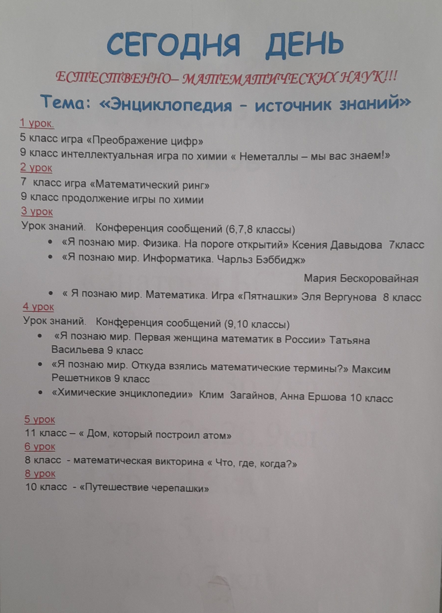 · СРЕДА (СЕГОДНЯ!): День естественно-математических наук — царит царство логики, формул, опытов и открытий! Физика, химия, биология, математика и информатика показывают свою магию.